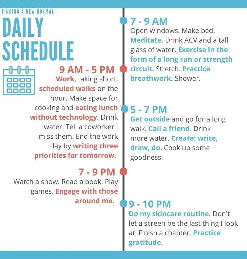 Millions like myself are fortunate to have the ability to work from home, which means adopting a new distributed work lifestyle. I knew as much about working from home as I do the inner workings of a vehicle. Thankfully, NPR's Life Kit series came to the rescue. They recommend creating a space that feels like an office. To do this, I cleared off half of our dining room table, brought in an extra lamp, and stacked up a few boxes to create a makeshift standing desk #bigdeskenergy. After creating a workable space, test your software and applications. If your Internet blows and you've got video calls on deck, try closing out of your other programs and shutting off the video portion of the call. For those with kids, try to stagger your meetings with your partner or other family members, if possible. Here's an example of a schedule that's helping my cousin and his wife navigate working from home with little ones.